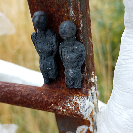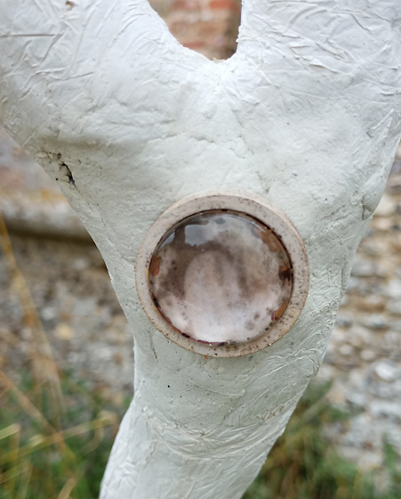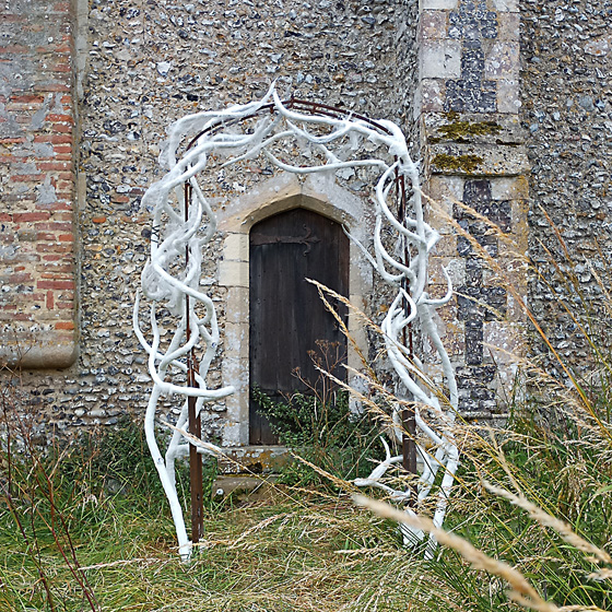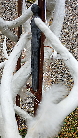 I questioned the meaning of belief. For me it is a personal journey – one that enhances my own perception of truth. Not only the here and now but something beyond that – something that is greater than ourselves. Inside a church, we celebrate this. My sculpture echoes the shape of the doorway. The branch like elements symbolise the cycle of birth, death and rebirth. I have added elements that explore my journey. Some I have collected on my way around the world.